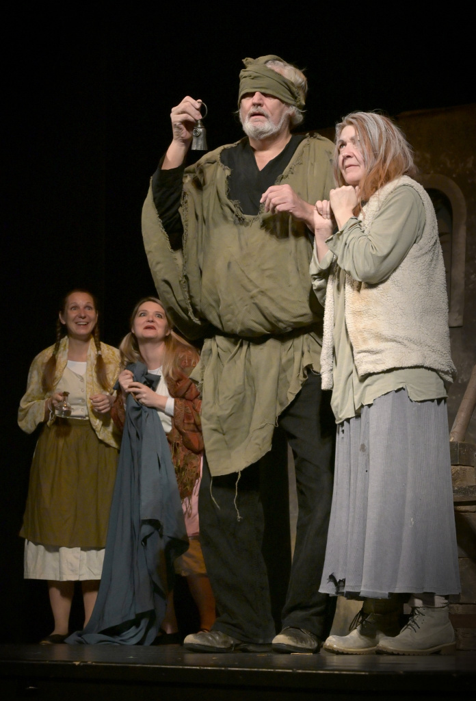 Skutečným dramaturgickým objevem byla pro mne Studna světců, kterou nabídla Společnost bloumající veřejnosti z Turnova. Napsal ji John Millington Synge, autor Hrdiny západu, již v roce 1905, u nás byla inscenována v pražském Národním divadle v roce 1921 v režii Karla Želenského, poté až v našem tisíciletí Michalem Langem ve Švandově divadle a Igorem Stránským v Uherském Hradišti; existuje také rozhlasová verze z roku 2014. Turnovští si předlohu upravili, Ivana Vondra Skokanová ji obratně a smysluplně zkrátila na polovinu a moralitu o slepých žebrácích Thomasovi a Mary, jejich vidoucích bližních, jednom světci a uzdravující vodě pojednali ve scénografii inspirované Pieterem Brueghelem. Motiv slepoty a navrácení zraku je pro ně možností zobrazit téma iluzí a reality, neschopnosti vidět to podstatné (ala Malý princ „to důležité vidíme pouze srdcem“) a intolerance vůči jakékoli jinakosti. Škoda, že se často hraje nikoli proces, ale výsledek, leccos zůstává pouze ve slovech a mnoho věcí v rovině záměru (např. činnosti jsou vymyšleny zvnějšku, takže nepomáhají a scénickým jednáním se nestávají – pletení košíků, sekání dřeva…). Nejvíce se blíží potřebnému hereckému stylu režírující Jan Marek v roli Světce, Iva Červová v roli Mary a částečně Ivana Vondra Skokanová jako Bride. Představení nepomohl dopolední hrací čas a osobně bych ocenila žánrový posun směrem k hořké anekdotě – ale jedná se o respektuhodný tvar.